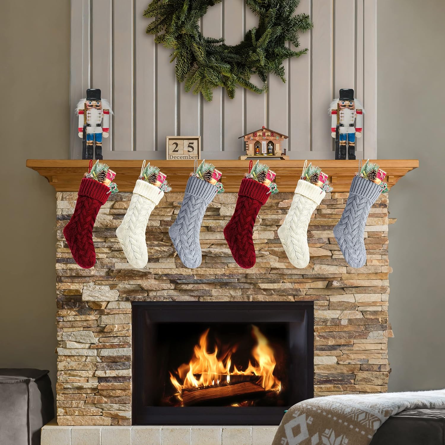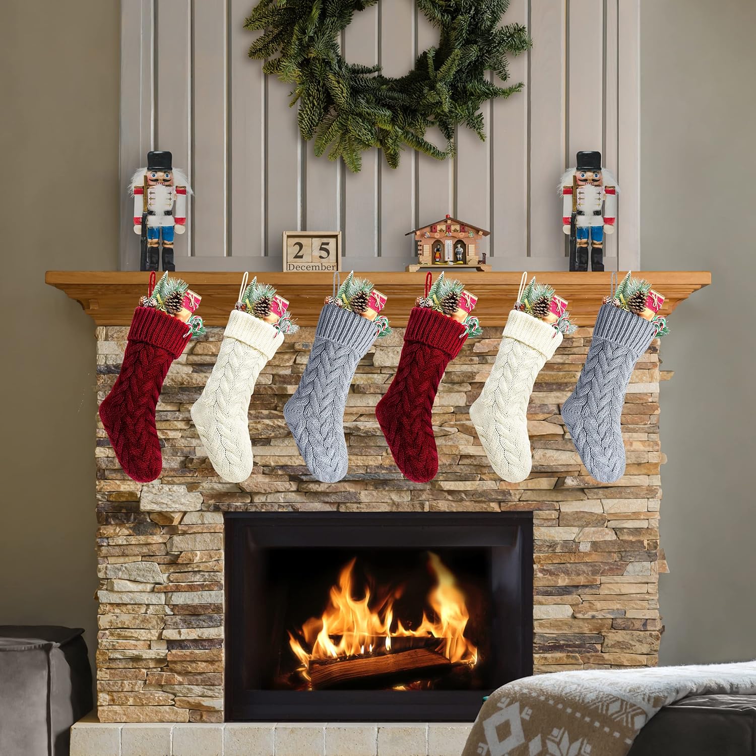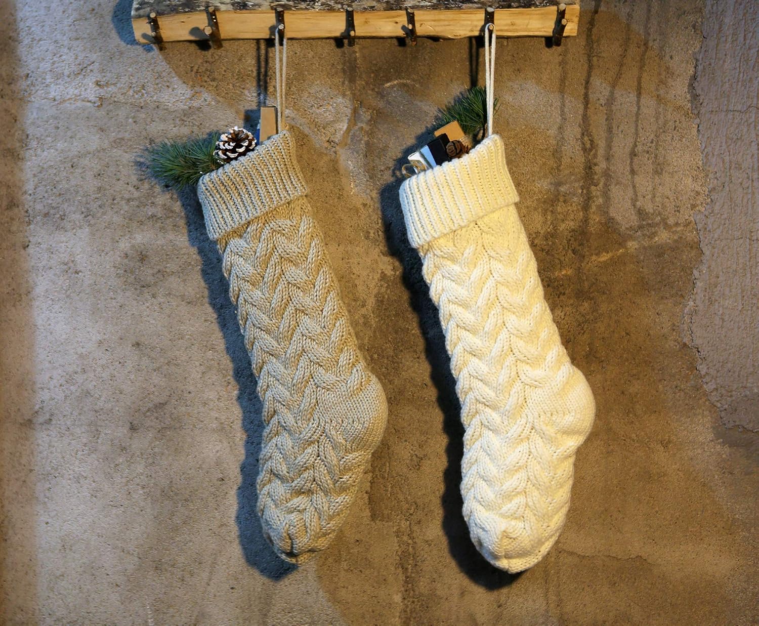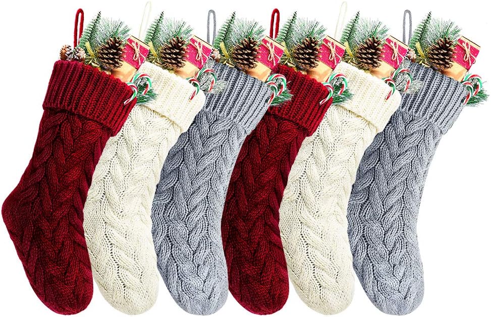 Specifications: Size:20 inches *6 inches Color: Burgundy, Khaki and ivory Material:Heavy woolen yarn Package Includes: 6 x 20" heavy yarn stockings, included 2 pack burgundy, 2 pack ivory, 2 pack Khaki Christmas stocking Features: 1. Classic rustic cable knitted Christmas stockings. 2. Made by thick heavy woolen knitted yarn giving you an old fashion Christmas and cozy feeling. 3.20" large size Christmas stockings for kids adults, large enough to hold many small gift, for you to fill candies or chocolates, watch, folding wallet, ties, gift cards, small toy cars, etc. 4.Ready to stuffed and hang on stocking hangers or mantle clips on fireplace mantel. Handmade style to create beautiful holiday memories for generations to come! Makes the perfect gift for family and friends.Great addition to holiday season decorations. Recommendation: 1.Custom monogram stockings by embroidering name on the top of the Christmas stockings. Making unique Christmas stockings. 2.Great addition to Christmas decorations. Also a nice present for your family and friends. 3.Charming when hanging on the mantel or stairs 4.The knitted patterns are place in BOTH SIDE, you can hang it from left to right or from right to left to make your own unique Christmas decoration.